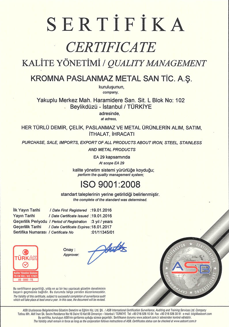 Kromna Paslanmaz Metal San. Tic. A.Ş. ülkemizde 30 senelik tecrübe, bilgi ve birikimimizle, son teknoloji makine parkuruyla paslanmaz imalatlarda sanayimizin hizmetindedir.
