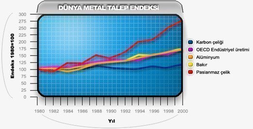 Aşağıdaki grafikte de görüleceği gibi paslanmaz çeliklere olan talep, özellikle son 20 yılda diğer malzemelere göre daha fazla gelişme göstermiştir.